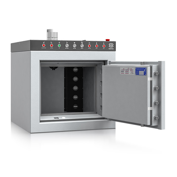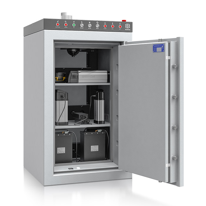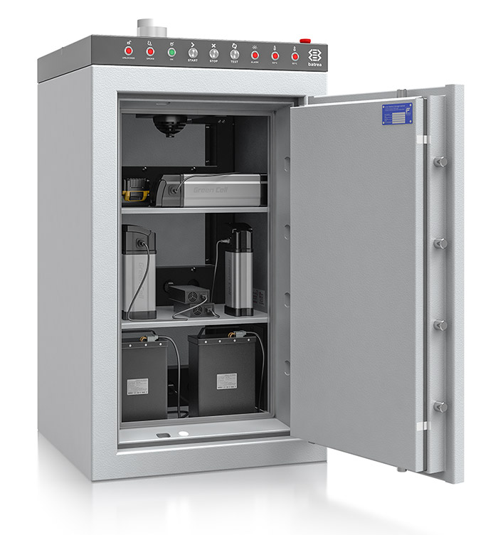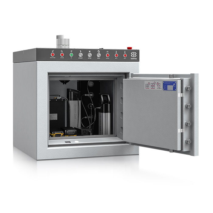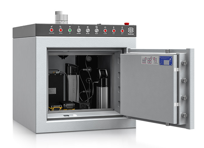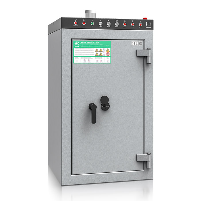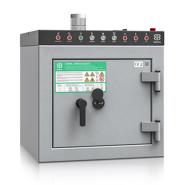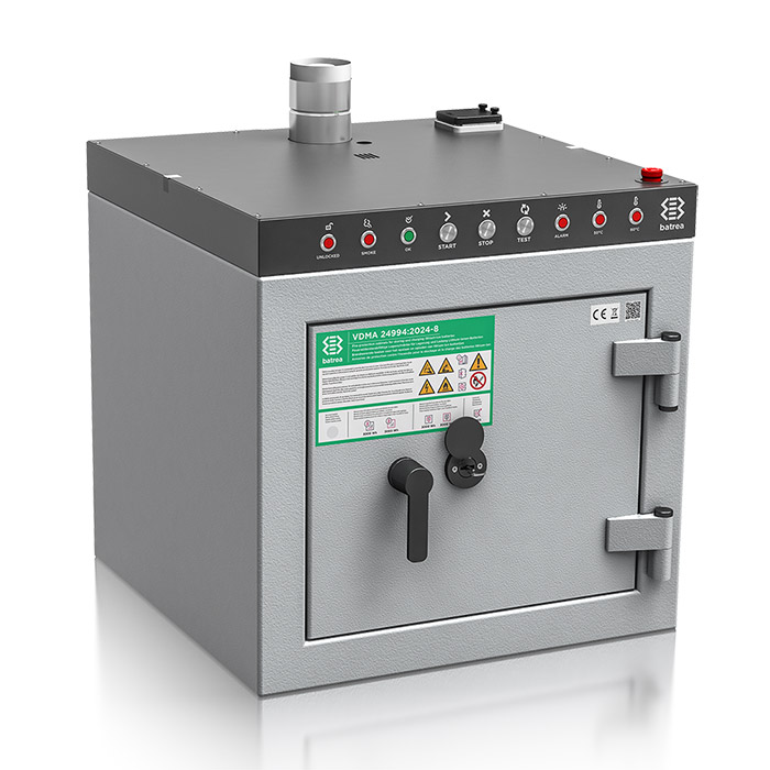 Geprüft an den gefährlichsten Batterien NMC 9-0,5-0,5. Sicherheit für Ihre Lithium-Ionen-Akkus beginnt mit der richtigen Lösung. Ein geprüfter Akkuschrank – häufig auch Akku-Safe oder Akku-Tresor bezeichnet – schützt nicht nur im Ernstfall, sondern reduziert auch das Risiko im täglichen Umgang mit Akkus. Unser feuerfester Akku-Schrank entspricht den Richtlinien der VDMA 24994:2024-08, wonach der Schrank extremen Bedingungen wie unkontrollierten Bränden und Batterieexplosionen, im Falle eines Thermal Runaway, mit höchstem Sicherheitsstandard standhalten kann. Die Zertifizierung wird durch eine unabhängige Zertifizierungsstelle erteilt und bei ECB•S anerkannten Kooperationspartnern geprüft.