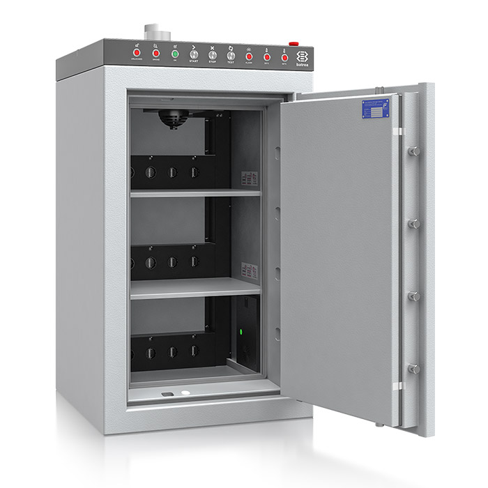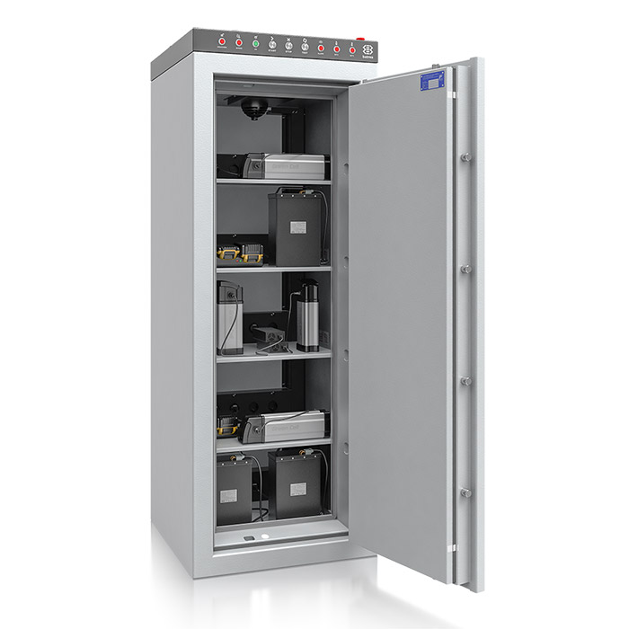 Unsere feuerfesten Akkuschränke bieten zuverlässigen Schutz bei der Aufbewahrung und Ladung von Lithium-Ionen-Akkus. Sie sind speziell dafür entwickelt, sowohl im Brandfall von außen als auch bei Akkubränden im Inneren maximale Sicherheit zu gewährleisten. Mit integrierter Stromversorgung, aktivem Rauch- und Temperaturmonitoring sowie Anschlussmöglichkeit für eine technische Entlüftung erfüllen unsere Modelle höchste Anforderungen im gewerblichen Einsatz. Ob Werkstatt, Industrie oder Lager – schützen Sie Mitarbeiter, Gebäude und Inventar durch geprüfte Sicherheit auf dem neuesten Stand der Technik.